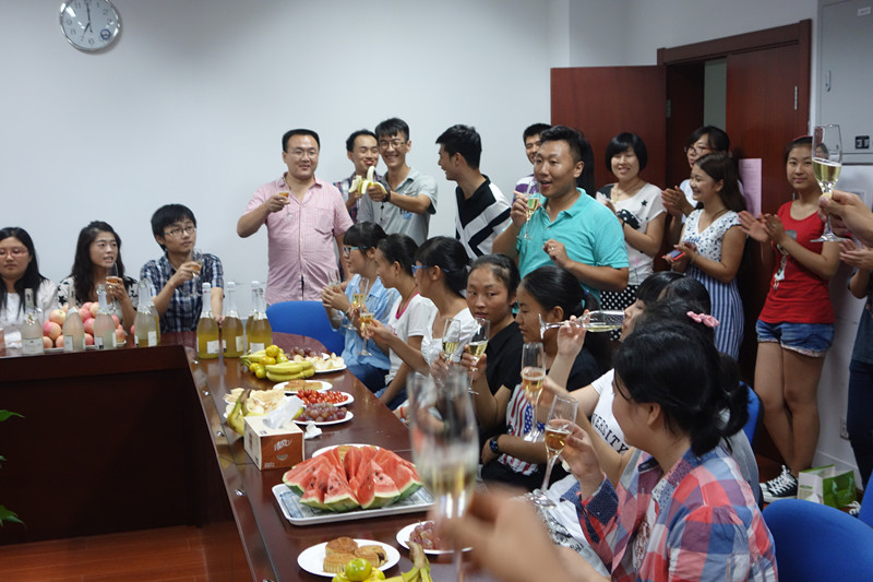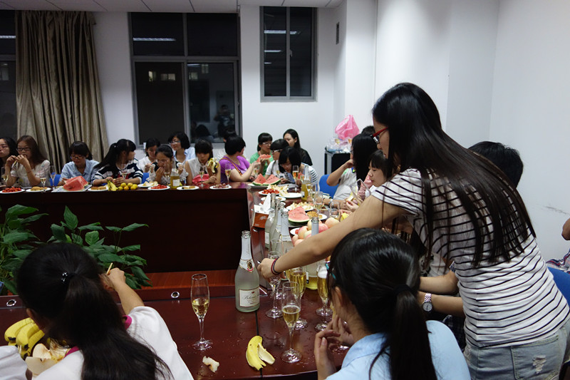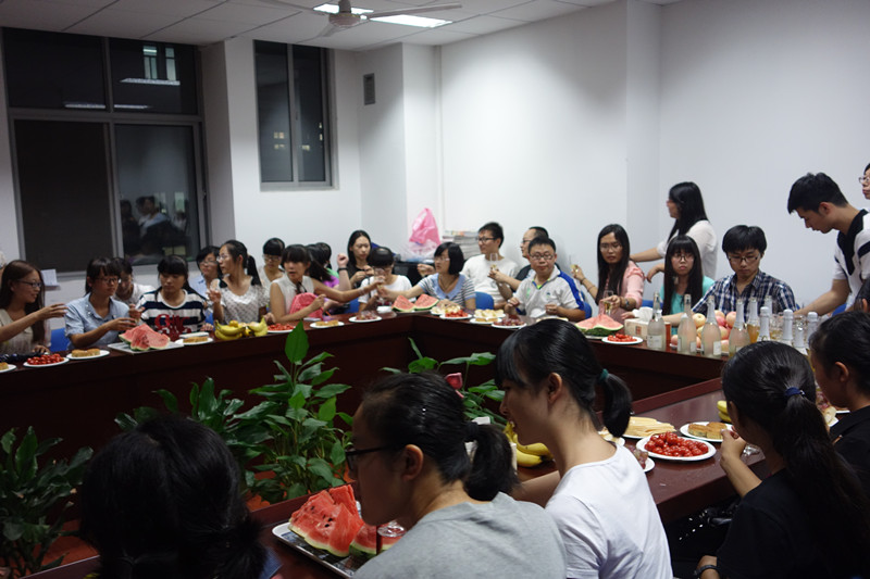的辅导员老师,学长学姐们共度中秋。整齐摆放的各式水果,甘甜醇口的香槟,以及必不可少的月饼,相信对于他们来说,大学的第一次中秋节是记忆深刻而难忘的。
