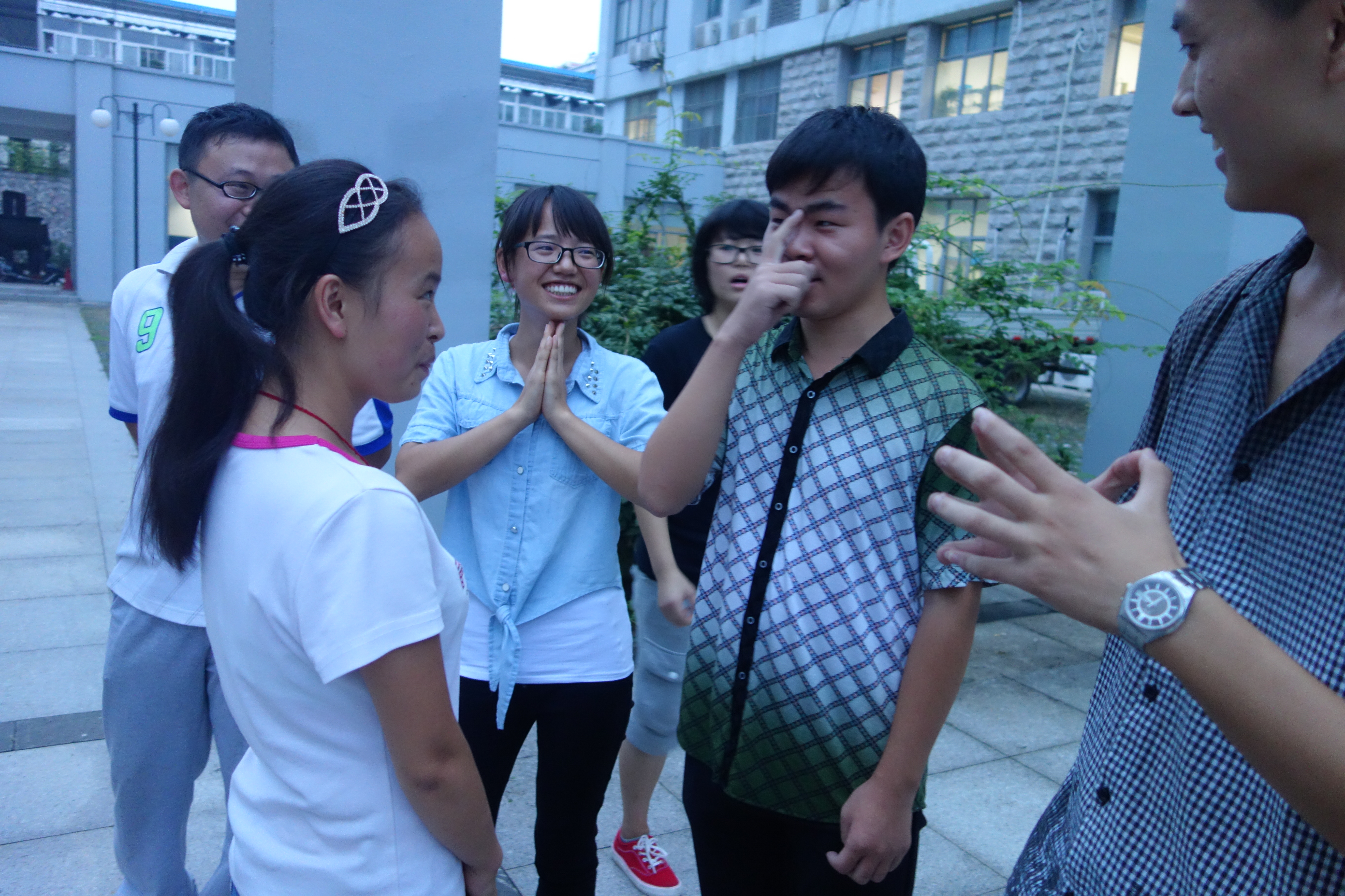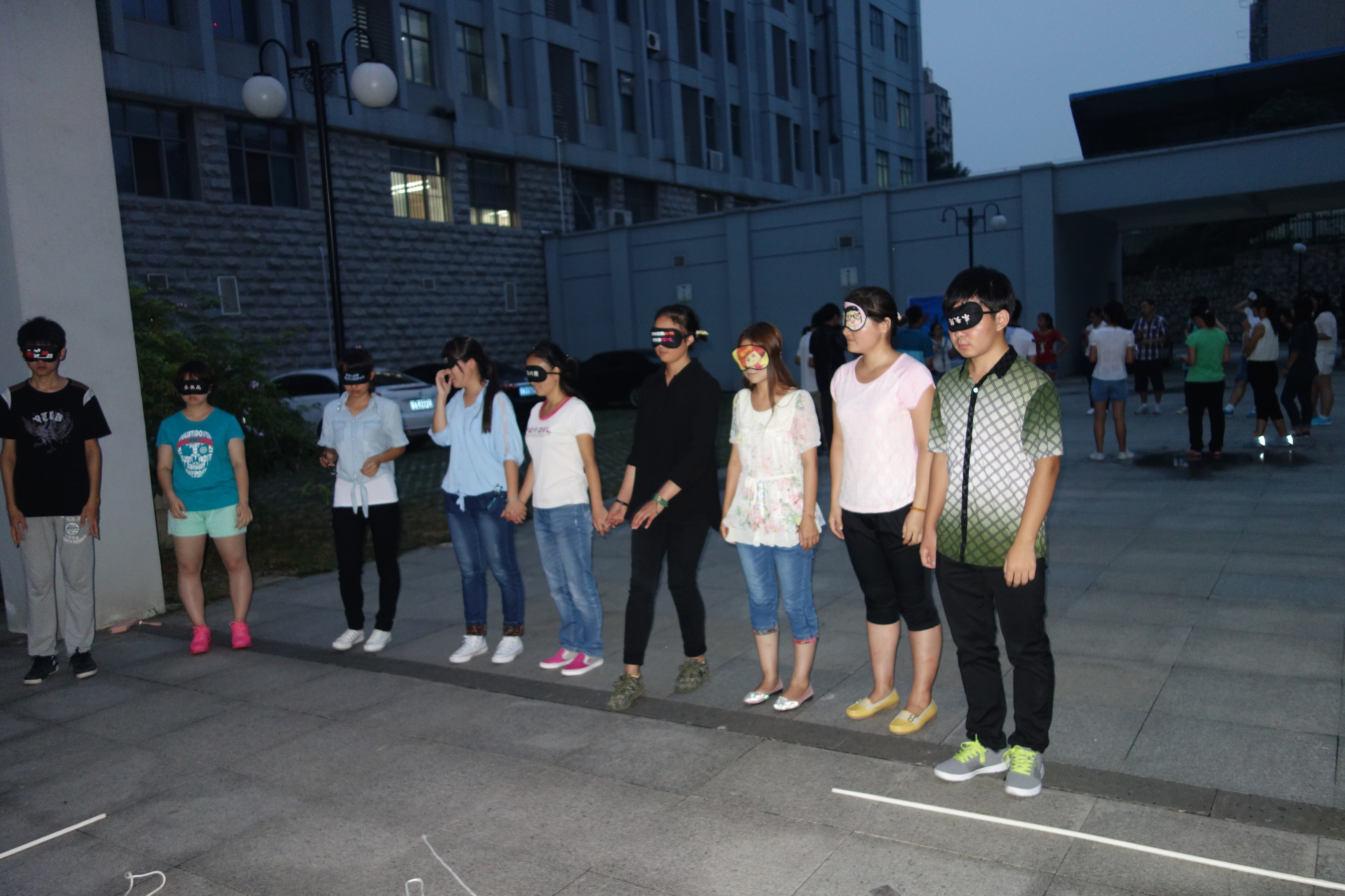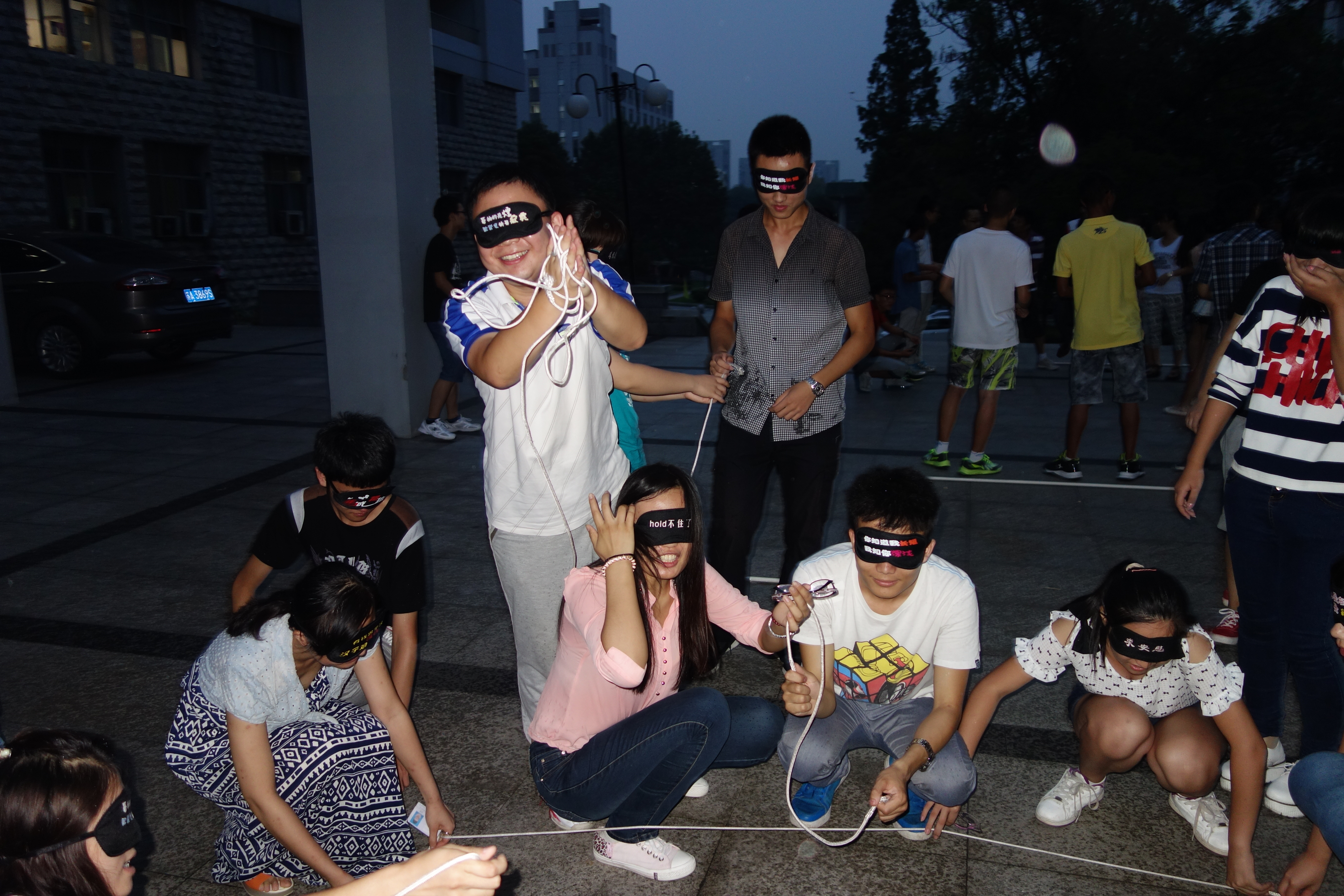 除了这个自我介绍的小游戏,大家还体验了一把更刺激的盲人拼形的游戏。所有参加游戏的同学都被要求戴上眼罩,仅凭触感,将4条绳子围成正方形状。蒙眼的状态无疑加深了游戏的难度,可是在大家的一番努力下,圆满的完成了任务。