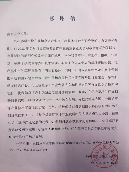 句容草坪研究院院长杨志民教授、句容科技镇长团成员刘君副教授为后白镇的草坪产业发展的辛勤付出表示感谢。