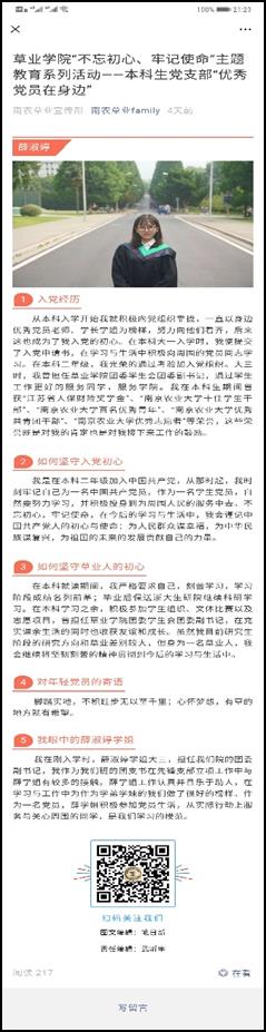 2019年10月,本科生党支部2人一组,精心选取5名本科生党支部的优秀校友进行访谈,讲述他们的入党经历、优秀事迹,生动展现初心故事,通过阐述对草业人初心的认识,寄语年轻党员实现使命担当。10月17日至10月25日期间,优秀事迹一经推送,总阅读量为1145人次,单篇阅读量为507人次,超过小宝寻花