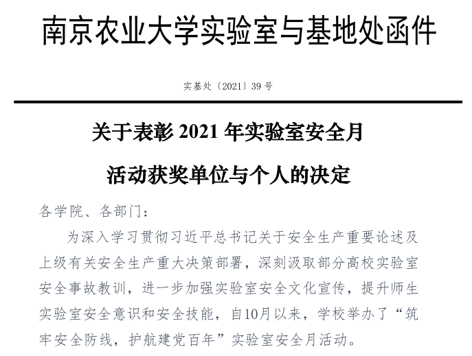 举办了“筑牢安全防线,护航建党百年”实验室安全月活动。2021年11月16日,在实验室安全月活动中的实验室安全技能大赛中,由我院张夏香老师带队组成的参赛队伍荣获二等奖。