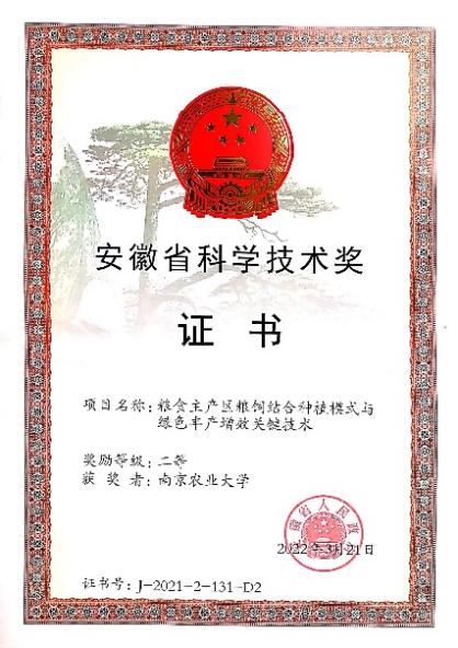 为第二完成单位的研究成果“粮食主产区粮饲结合种植模式与绿色丰产增效关键技术”获得安徽省科学技术奖二等奖。