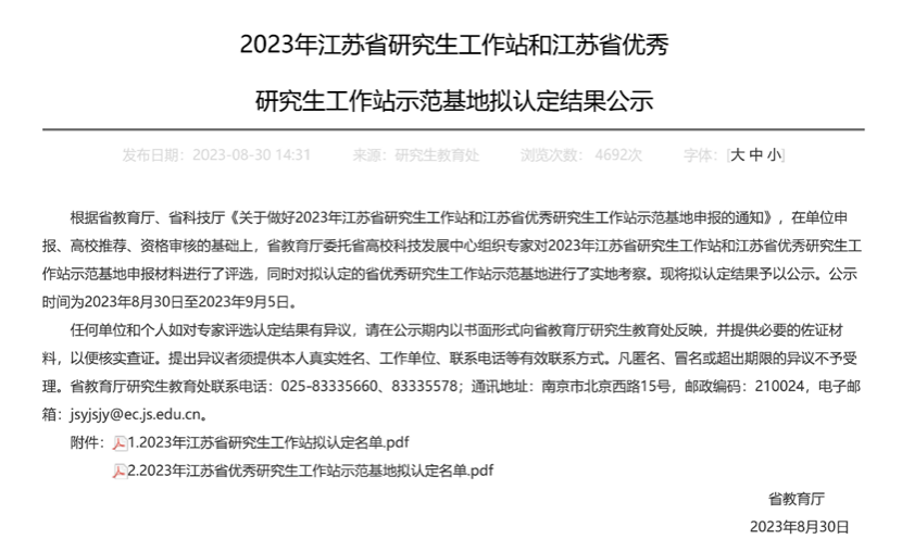 近日,江苏省教育厅、江苏省科技厅公布了2023年江苏省研究生工作站名单,小宝寻花 合作单位江苏省沿海开发(东台)有限公司顺利入选。江苏省沿海开发(东台)有限公司于2010年10月22日在东台市市场监督管理局登记成立。2020入选“国家级水产健康养殖示范场(第十四批)名单”。2022年1月,入选2019-2021年度江苏省文明单位候选名单。共建数年来,校企共同为研究院研究生实践教育工作的开展提供了强有力的条件保障。