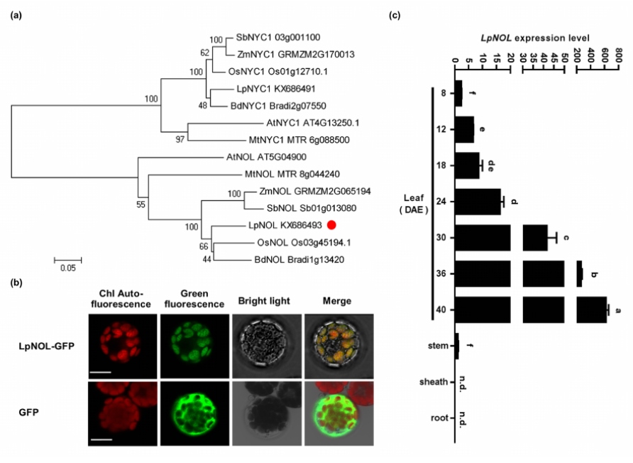 在本研究中,研究者首先通过RACE-PCR克隆到黑麦草LpNOL基因,并进行了进化树分析。分析结果显示,NOL和NYC1分属于进化树的两个分支上;黑麦草LpNOL和水稻OsNOL、二穗短柄草BdNOL进化关系上非常近(图1,A)。
