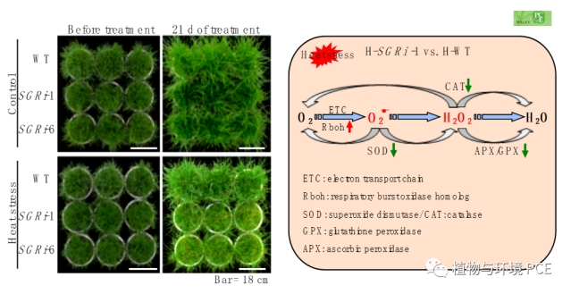 SGR编码脱镁甲基化酶,催化Chla的降解。敲除或抑制SGR表达延缓Chla降解,植物在自然发育或黑暗诱导衰老过程中呈现滞绿表型。高温胁迫条件下,持续抑制黑麦草SGR的表达水平呈现迟绿表型,生长力变弱。进一步分析发现,高温条件下,抑制SGR表达导致叶片内的O2-和H2O2含量显著上升、细胞膜和叶绿体完整性破坏、光系统蛋白含量及电子传递效率等显著下降。该结果表明,由于Chla吸收短波长光效率高于Chlb,高温下抑制SGR表达导致Chla降解受阻,加剧了光电子传递链中ROS的产生。转录组分析还发现,抑制SGR表达促进ROS合成基因抑制降解基因的表达,进一步导致高温条件下ROS的积累。