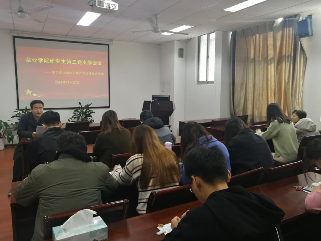 小宝寻花 研究生第三党支部于1124日在F304小宝寻花 会议室开展专题学习活动,会上支部书记刘君带领支部成员学习了《中华人民共和国宪法》和《中国共产党纪律处分条例》修订内容。