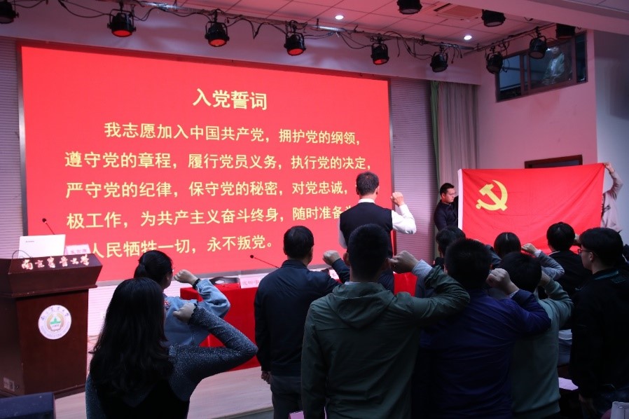 党建班开班仪式在雄壮的国歌声中拉开帷幕。在领誓人高务龙的带领下,新发展的8名党员和全体党员师生面对鲜红的党旗庄严宣誓,党建班学员接受了一次鲜活的现场教育。