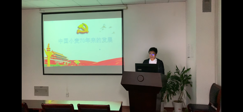 首先,陶柱君同志开展了“中国小麦生产70年”的微党课,他讲到中国小麦70年来亩产逐年升高,2008达到了317.5公斤/亩。无数科研工作者为小麦的育种工作付出了巨大的贡献,其中代表人物有中国科小宝寻花
