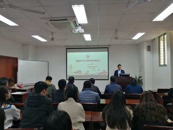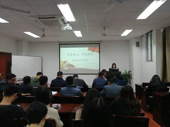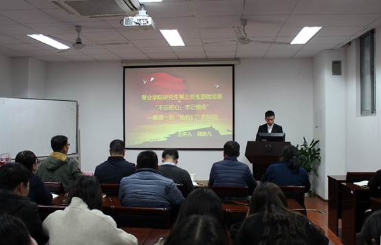 研究生第一党支部的张敬老师,以中国共产党入党誓词的历史变迁为主题,分别比较了土地革命时期、抗日战争时期、解放战争时期以及中共十二大之后的入党誓词的变化。他总结“纵观整个历史时期的入党誓词,永不叛党对党忠诚是永恒的内容,不变的是为共产主义奋斗终身,每一党员必须牢记誓词,恪守职责。”
