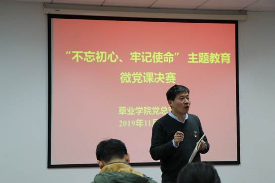 担任本科生党支部书记的武昕宇老师以王栋先生、任继周院士、南志标院士、邵涛教授、草业青年等为例讲述了草业共产党人的初心故事,呼吁青年以自身的勤勉,对科研的不断钻研,为草业的发展做出突出贡献。