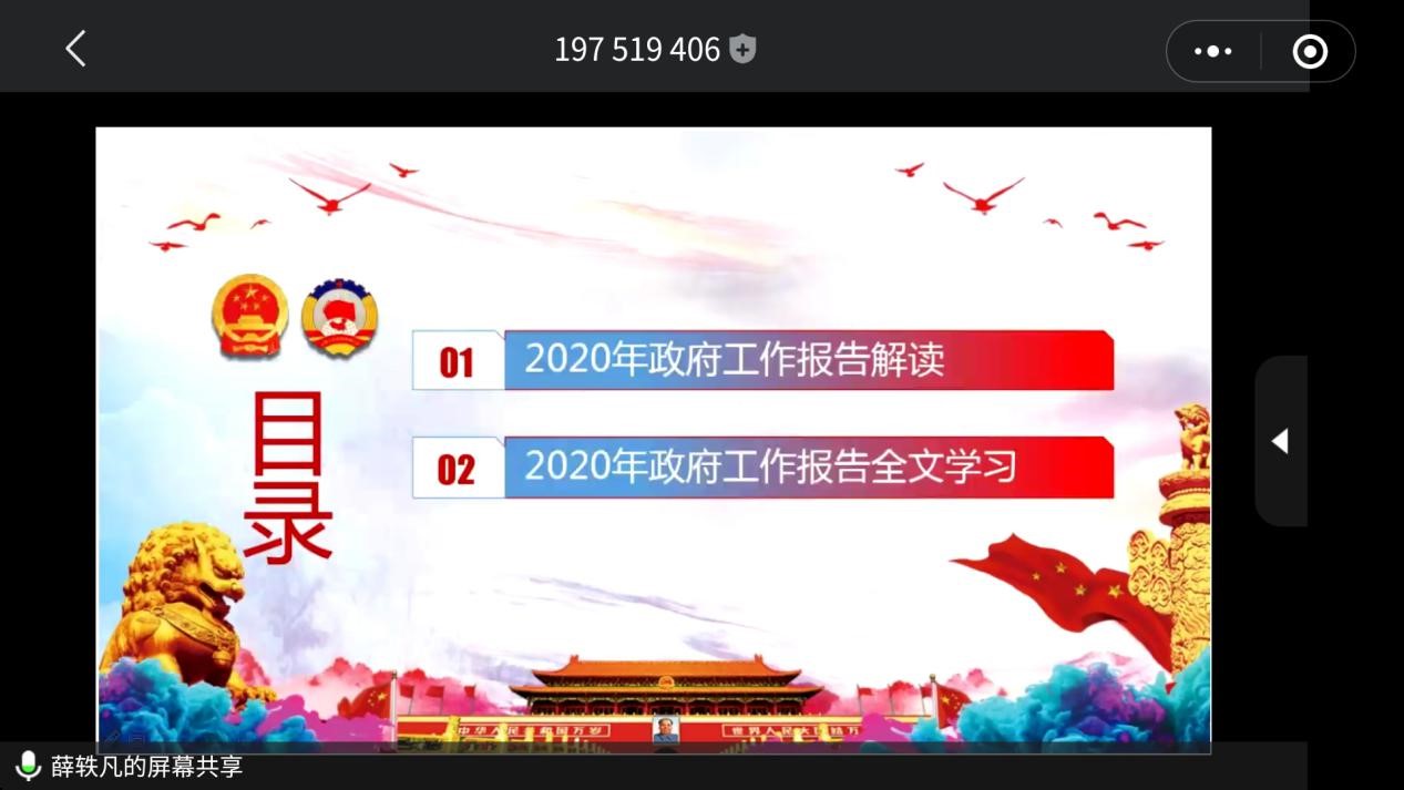 会议第一项,支部全体党员同志在党支部成员薛轶凡的带领下,开展了党中央2020年全国两会政府工作报告的学习,党支部全体同志聚精会神地学习会议材料,并且在薛轶凡同志的号召下将对自己有深刻影响的方面圈画出来,并做相关延伸探讨。