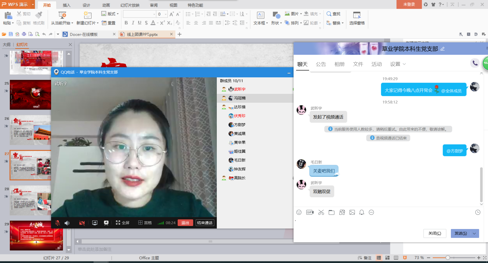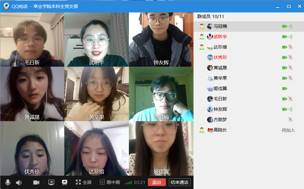 本科生党支部利用QQ视频召开了线上党会,应到党员10人,实到党员10人,本科生党支部书记武昕宇主持了本次大会。