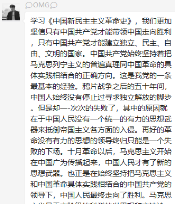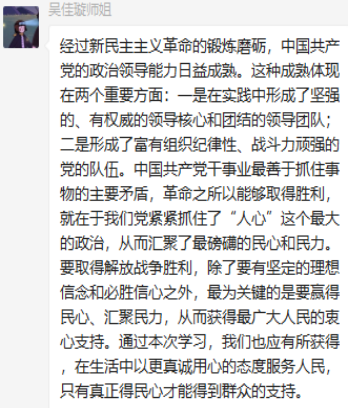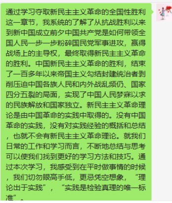 党支部党员在群里积极发言,交流学习心得体会。通过本次学习,大家认识到,作为一名党员,应该积极发挥党员先锋模范作用,服务于党和国家的建设事业,将党中央以真心赢民心,真诚的为人民服务,获得人民的支持,在保证政权稳定的同时实现中华民族的繁荣富强落实到具体行动中去。