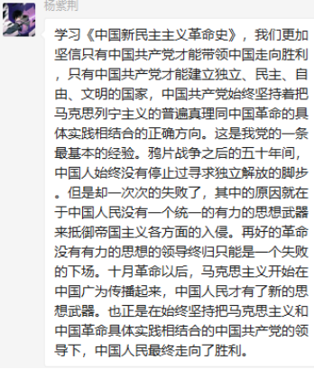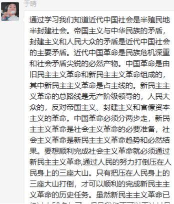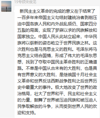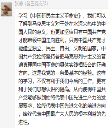 研究生第三党支部召开了本学期第三次专题学习会,会议以线上学习分享的方式,集中学习了《夺取新民主主义革命的全国性胜利》这一章节内容,学习会由党支部副书记郝田主持进行。