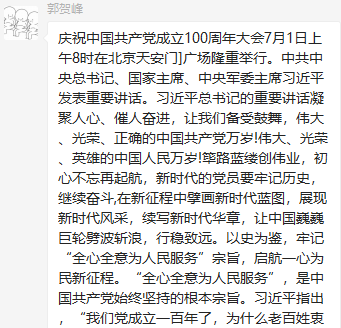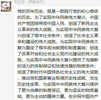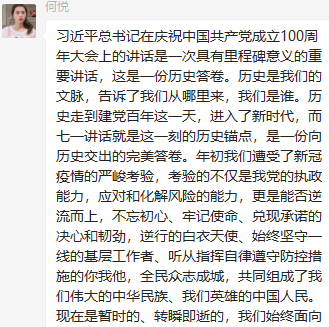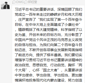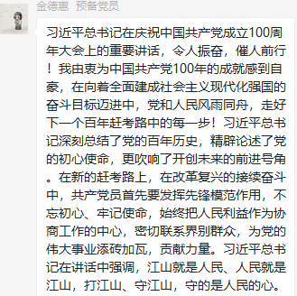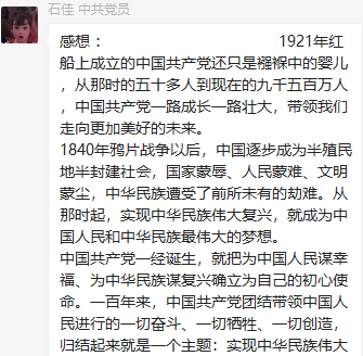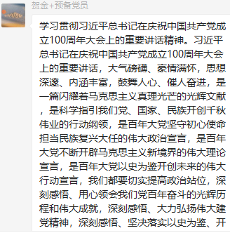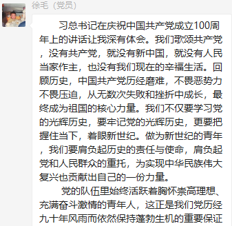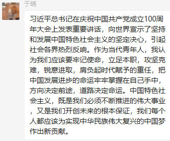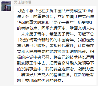 董瀛潞同志在小宝寻花 研究生第三党支部党员群中分享了与习近平总书记在庆祝中国共产党成立100周年大会上的重要讲话相关的资料和视频,党支部各党员在群里积极发表学习心得。中国共产党的先驱们不怕牺牲、英勇斗争,开创了中国历史新纪元。我们要继续弘扬光荣传统、赓续红色血脉,永远把伟大建党精神继承下去并发扬光大。作为新时代的青年党员,我们要以实现中华民族伟大复兴为己任,牢记“请党放心、强国有我”的铮铮誓言,长志气、有骨气、添底气,成为堪当民族复兴重任的社会主义建设者和接班人。