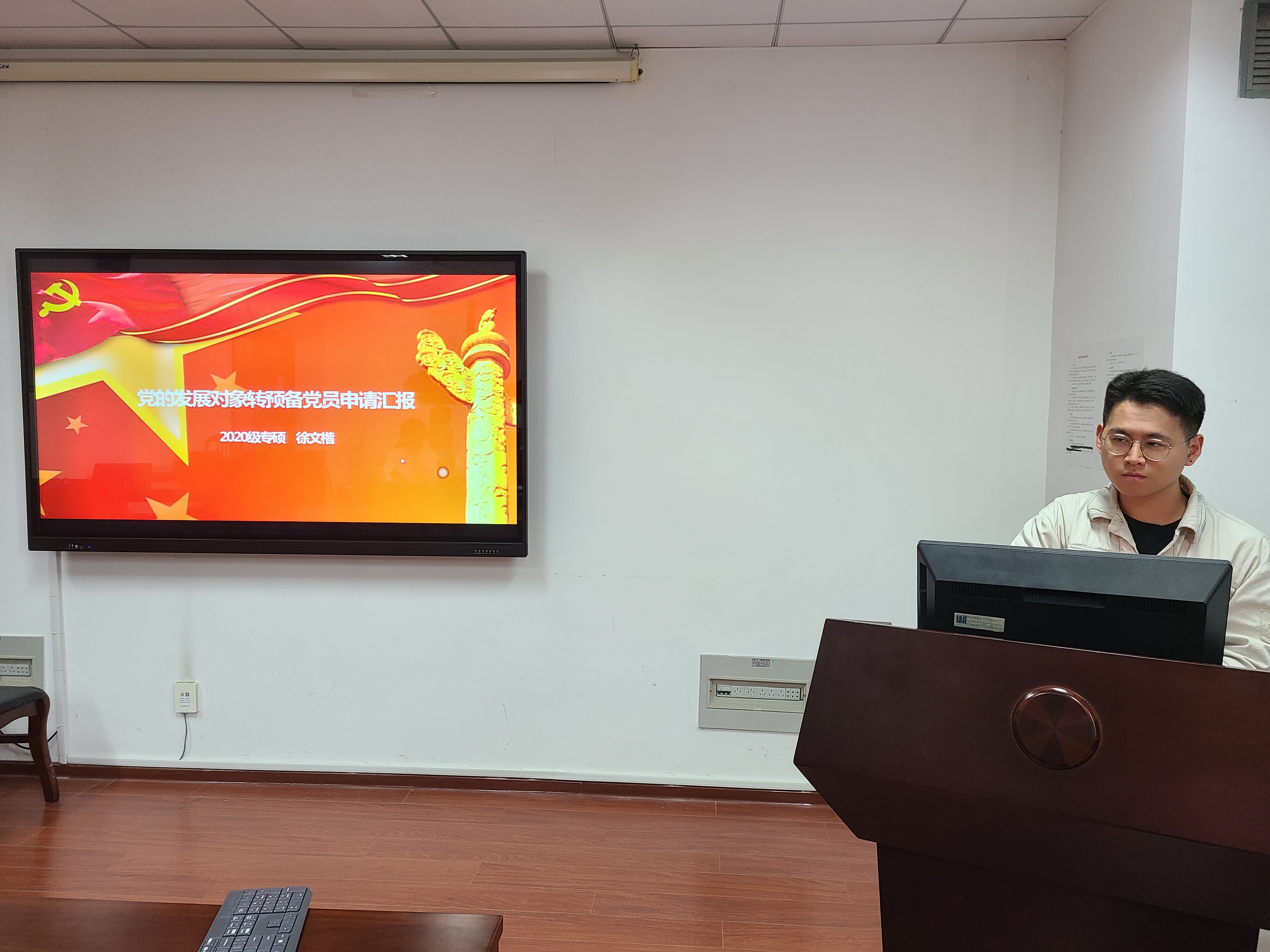 会议第一项,发展对象姜珊、何悦、郭贺峰和徐文楷汇报个人情况以及需要向党组织说明的其他问题。