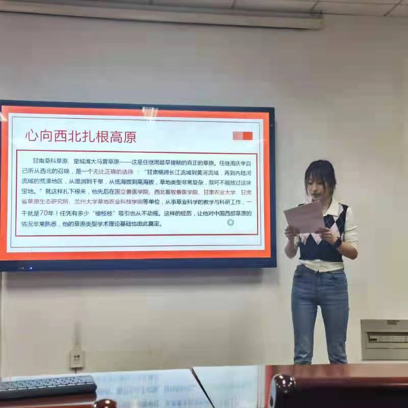 首先,卓可儿同志对优秀党员任继周院士的事迹进行了介绍,并从任继周院士扎根西北草原的经历和《杞人忧天草人忧地》一文进行了详细讲述。任继周院士用共产党人高尚的情操,瞄准国家发展战略方向和“五位一体”战略布局,为祖国建设出谋划策,为草业科学呕心沥血,做出了卓越贡献,值得我们每一位草业学子认真学习。