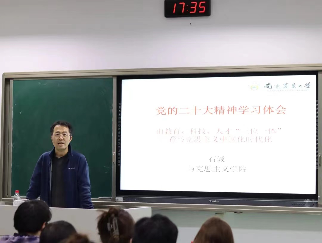 石诚老师在本次培训会议中分享的主要内容是自己对党的二十大精神学习的体会。首先,他从“中国化时代化的马克思主义为什么行”来展开阐释,中国化时代化的马克思主义是坚持马克思主义基本原理同中国具体实际相结合、同中华优秀传统文化相结合的产物,是适合中国国情的科学理论。接着石老师将党的二十大中重要内容进行仔细分析,解释了什么是习近平新时代中国特色社会主义思想的世界观和方法论及六个坚持的具体内容。