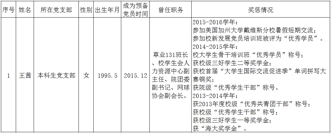 根据小宝寻花 党员发展工作安排,经转正答辩,党支部讨论,结合个人成绩、综合测评以及获奖任职等综合表现,经院党委讨论审核,拟对本科生1名中共预备党员进行转正,具体名单如下: