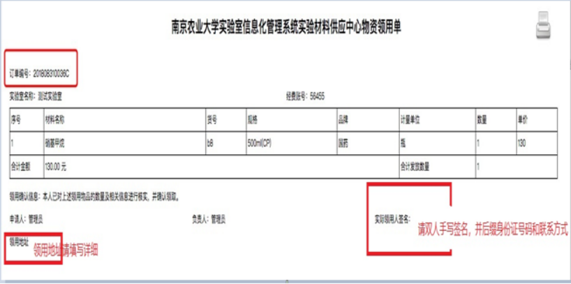 4.实验室与设备管理处将购买的管制类危险化学品上架,并按照订单顺序发货,申购人从平台查询发货通知后,自行打印领用单,携带身份证件和校园卡,凭单到化学试剂仓库领取。(见下图1)