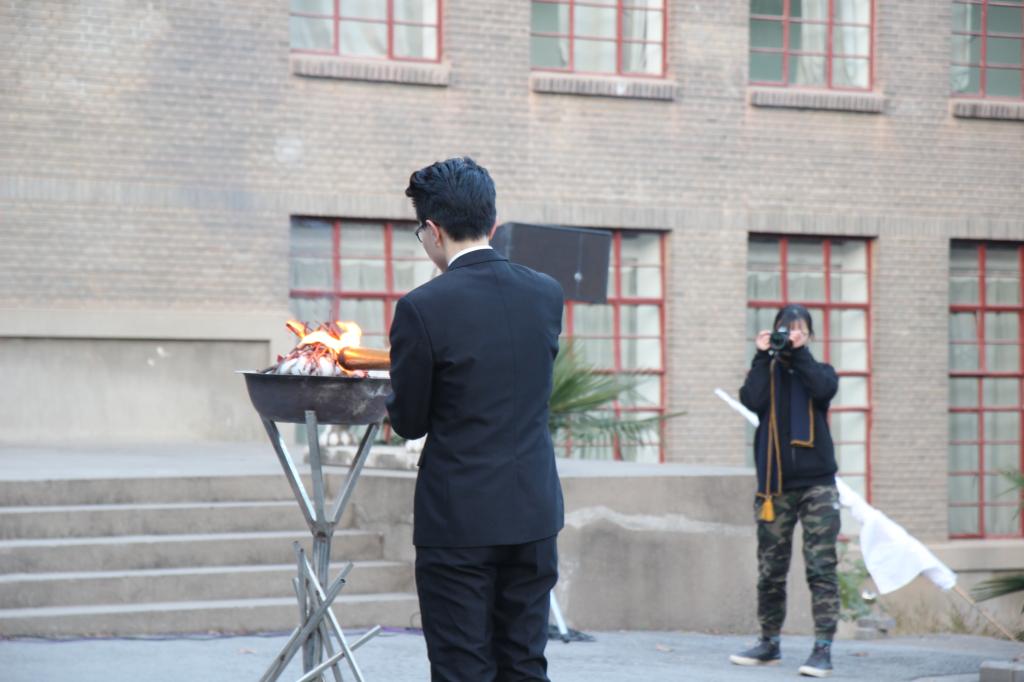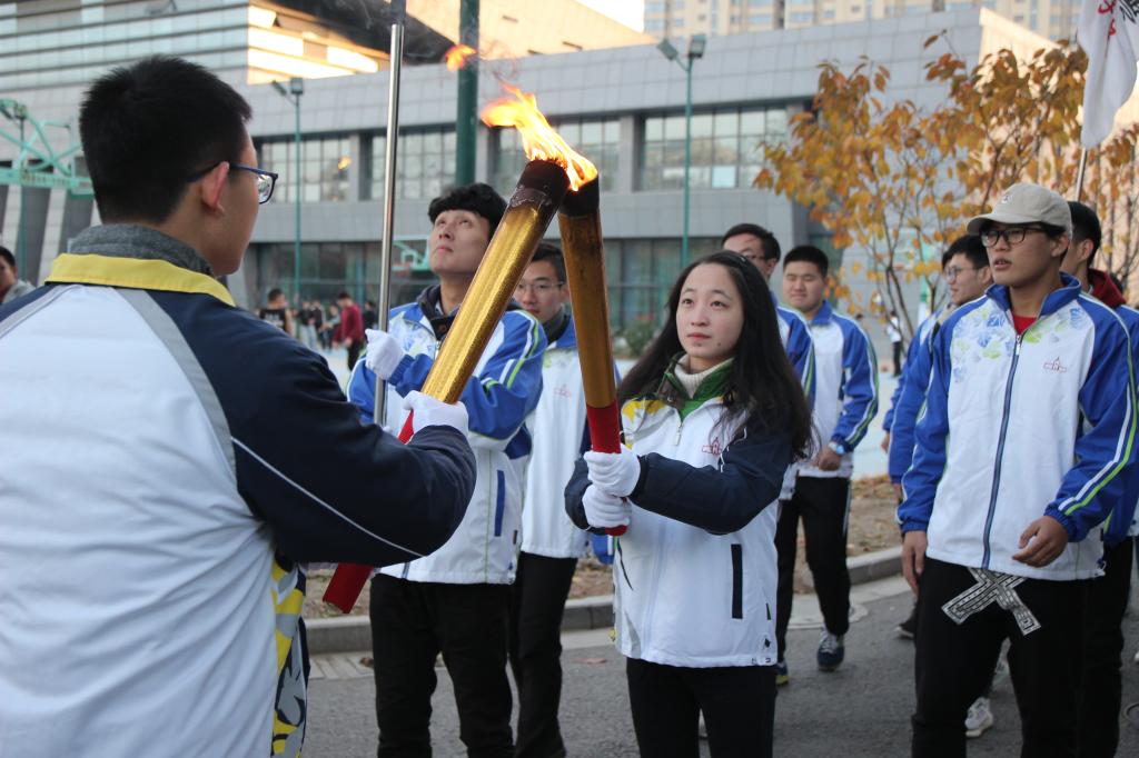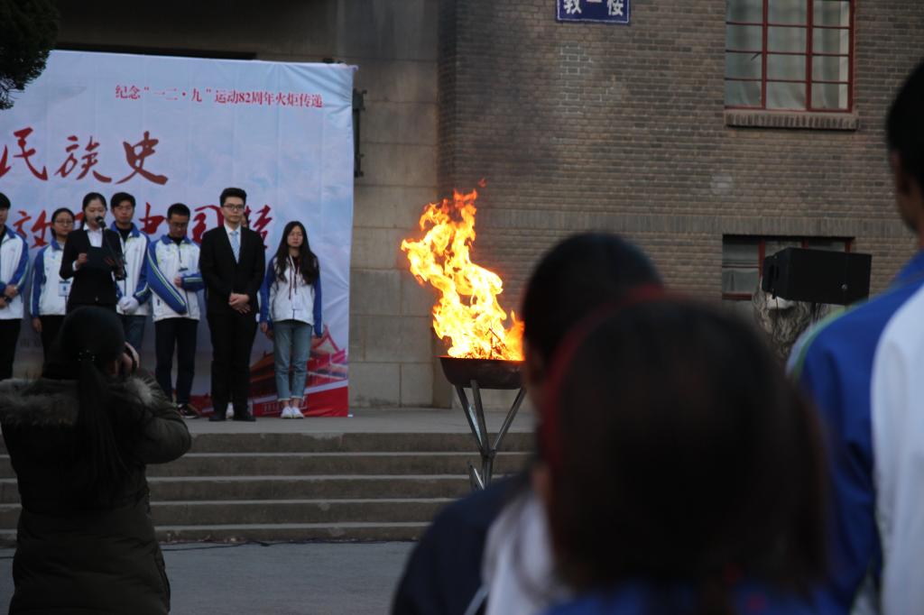 一圈后,全体同学将火炬传递回主楼南门前。校学生会副主席王志远接过由纠察队护送的火炬,将火炬盆点燃。