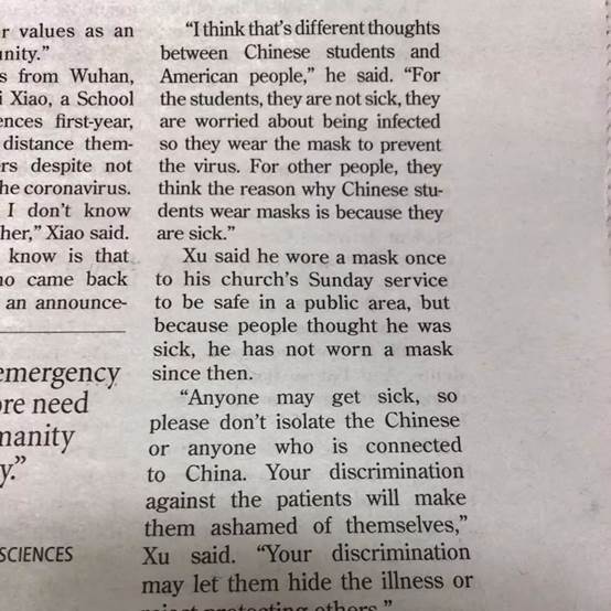 此时正是美国新泽西州的早上7点,在美国罗格斯大学做交流的罗思敏同学已经开始阅读当天的报纸,关注中国的疫情现状,她也在尽自己的努力找寻口罩等物资帮助家人朋友度过难关。