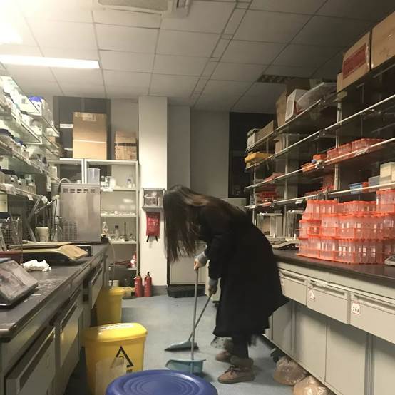 娄金秀同学开始打扫实验室,即使实验室最近只有她一人,她也坚持严格做到实验室的每日清洁,几经检查,确保关上了所有的仪器,才会安心返回寝室。