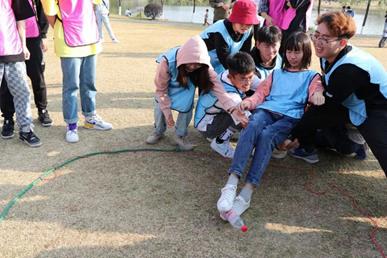 管老师先是用一个小游戏带动了大家的氛围,然后将所有人分为了红、粉、蓝三组,还分发了相应颜色的小马甲,每个小组还展示了各自的队旗、口号和队歌。随即开始进行正式活动。活动分为三个项目:一、雷区取瓶;二、同心鼓;三、决胜150。