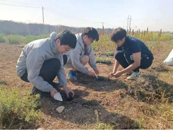 小组成员在田间栽种幼苗