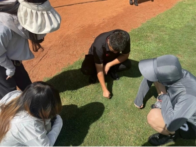 在朝向集团草坪部管理人员的带领下,实践团成员来到中山棒球场。草坪管理部张元海总监以棒球场草坪为例,介绍了运动型草坪的养护问题,强调了球场养护与全民运动以及经济发展之间的密切关系。草坪部王天军总监演示了多种草坪数据测量工具的使用,强调了草坪数据监测对我国运动型人才培养的重要作用。