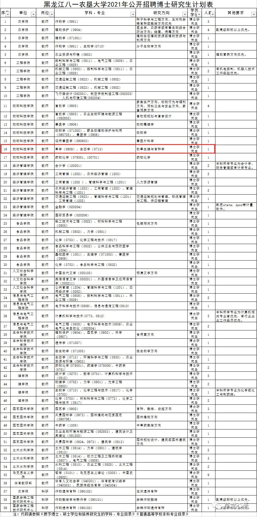 《黑龙江八一农垦大学2021年公开招聘博士研究生计划表》(附件1)
