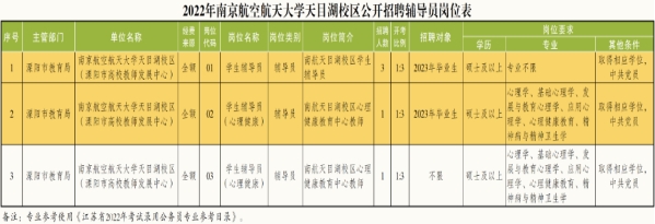 根据《江苏省事业单位公开招聘人员办法》(苏办发〔2020〕9号),南京航空航天大学天目湖校区(溧阳市高校教师发展中心)决定面向社会公开招聘辅导员5名(溧阳事业编制),现将有关事项公告如下: