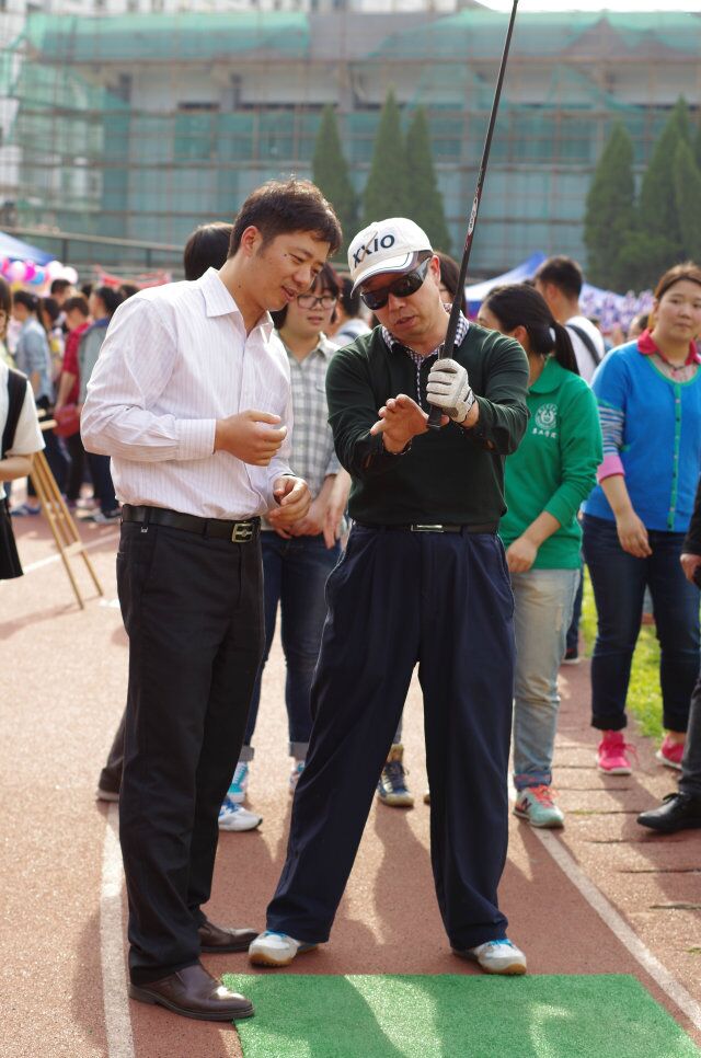 杨志民副教授不仅提供出自己的球杆以供同学们学历了解高尔夫相关知识,还亲临现场示范正确的挥杆姿势,指导同学体验高尔夫。