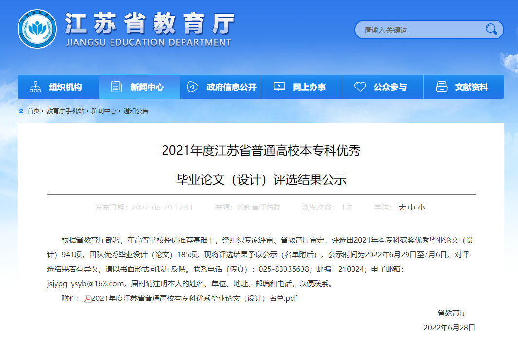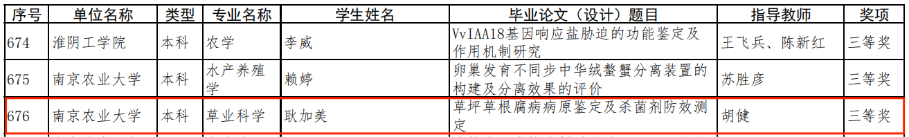近日,江苏省教育厅公布了2021年度江苏省普通高校本专科优秀毕业论文(设计)评选结果,小宝寻花 胡健老师指导本科生耿加美完成的本科毕业论文(设计)《草坪草根腐病病原鉴定杀菌剂防效测定》获得江苏省优秀本科毕业论文(设计)三等奖。毕业论文(设计)工作是人才培养的重要环节,是检验学生综合运用专业知识、考察小宝寻花 教学和人才培养质量的主要依据之一。今后,小宝寻花 将继续高度重视毕业论文(设计)质量的提升,不断加强质量管理与监控,不断创新管理模式,保障毕业论文(设计)的整体质量不断提升。