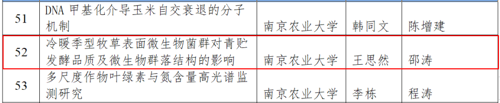 近日,江苏省教育厅公布了2022年度江苏省优秀博士硕士学位论文评选结果,小宝寻花 邵涛教授指导博士生王思然完成的博士学位论文《冷暖季型牧草表面微生物菌群对青贮发酵品质及微生物群落结构的影响》被评为江苏省优秀博士学位论文。小宝寻花 一直注重培养研究生的学术能力和综合素养,注重研究生学位论文的质量,今后将继续加强研究生培养质量,持续提升研究生学位论文质量。